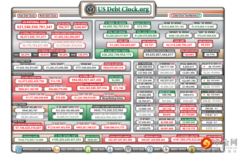 从这个每一秒都在跳动的“美国债务时钟”中,我们可以看到此时此刻美国联邦债务总规模高达31.54万亿美元。