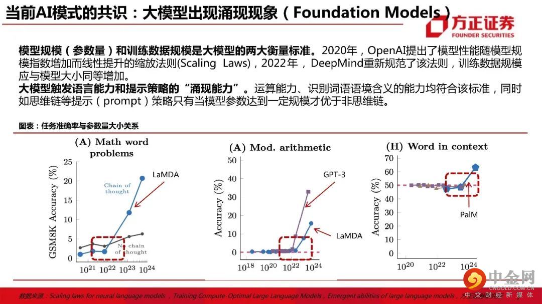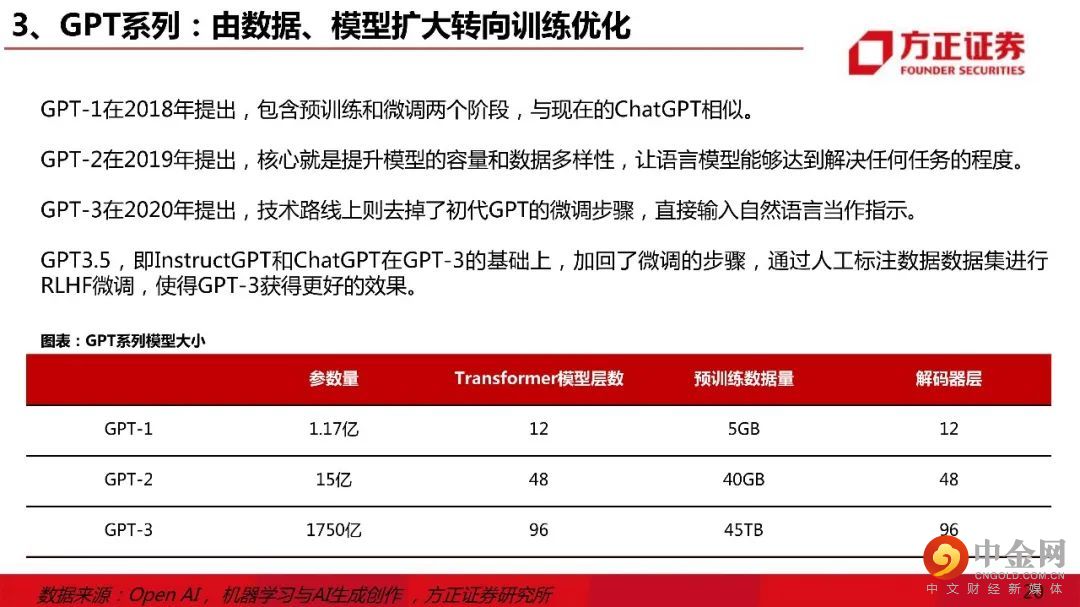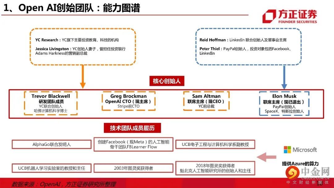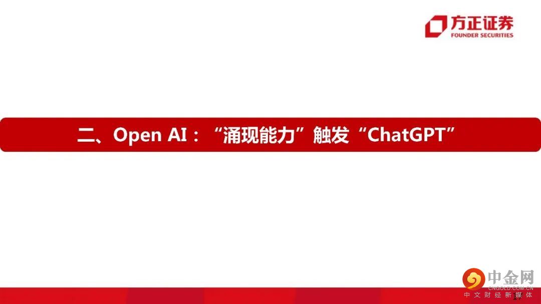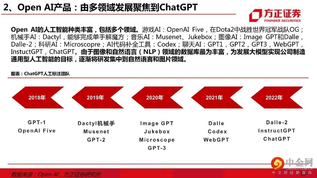二、Open AI:“涌现能力”触发“ChatGPT”。1)Open AI创始团队:能力图谱。OpenAI的早期投资团队主要由硅谷顶级的创业孵化器YC和Paypal创始人&早期员工圈子;2)Open AI产品:由多领域发展聚焦到chatGPT。OpenAI产品由早期游戏、机器人、科研等多个领域聚焦至ChatGPT;3)GPT系列:由数据、模型扩大转向训练优化。GPT1-3的提升主要在模型规模和预训练数据大小,ChatGPT在技术路线上转入模型的微调。