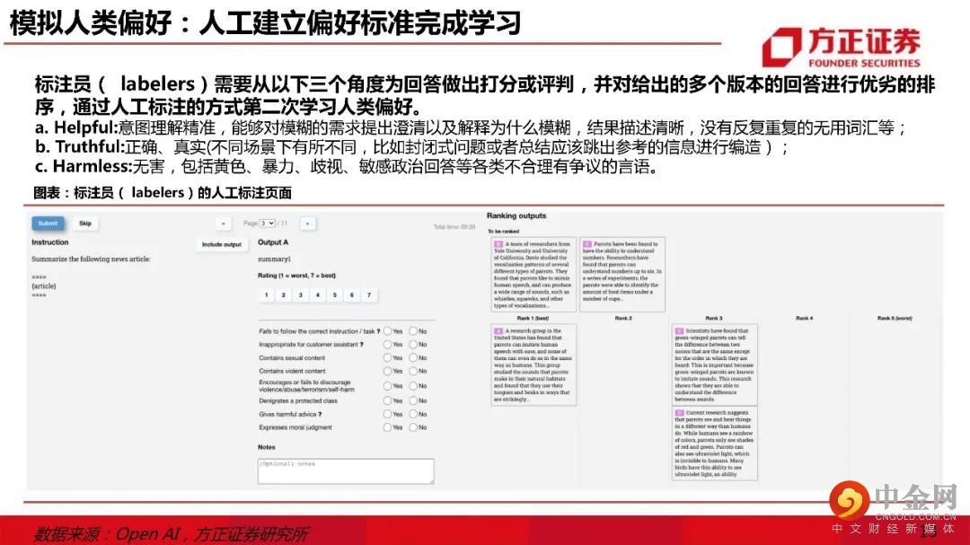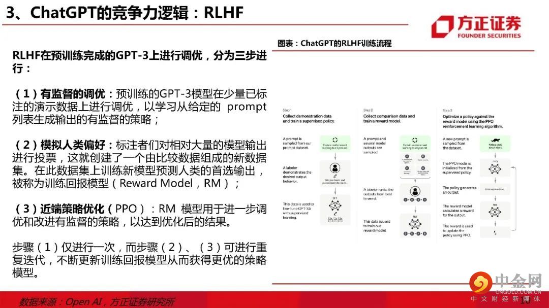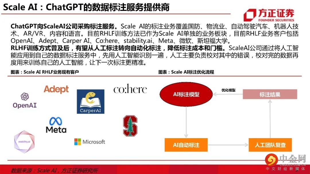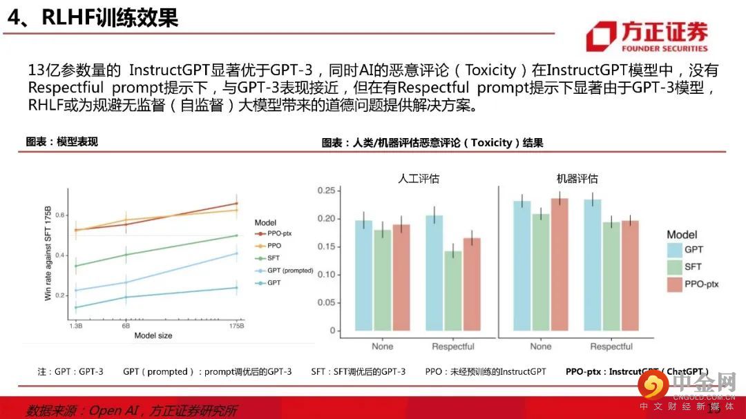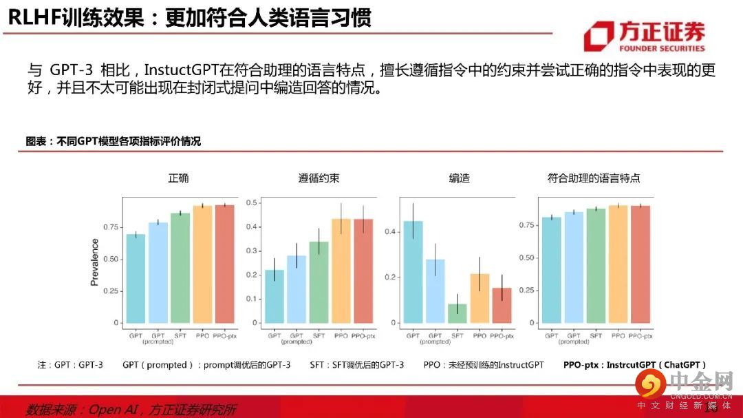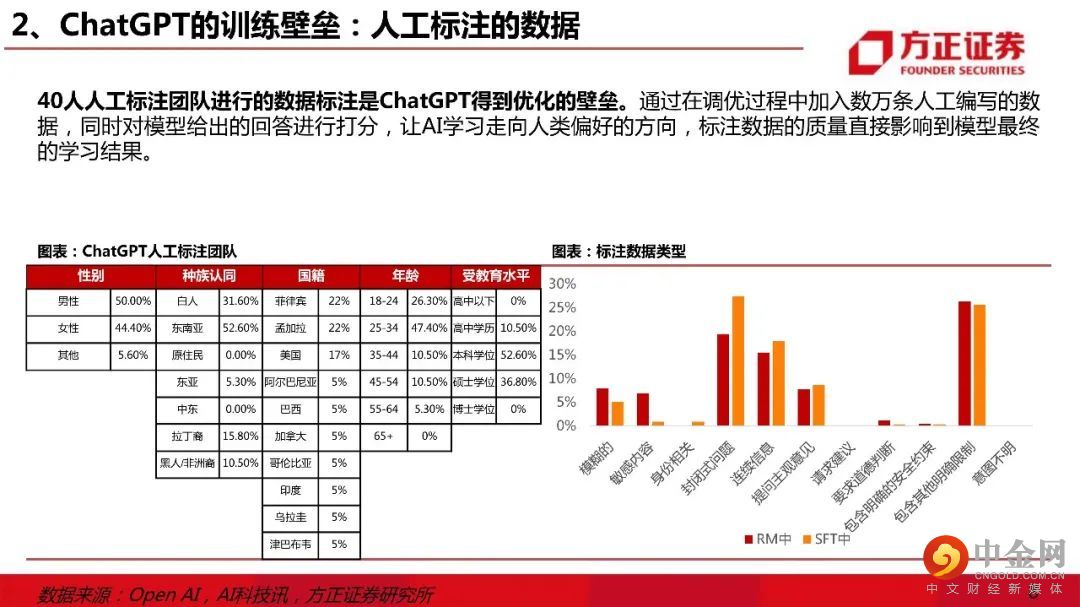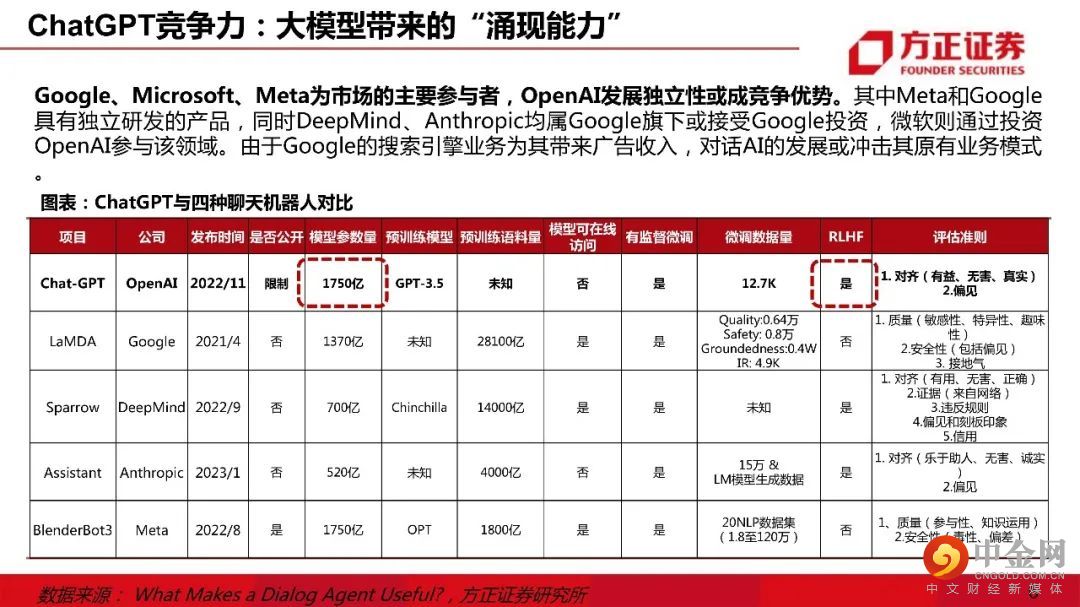 一、ChatGPT核心壁垒:大模型 & RLHF。1)主流底层模型:文字Transformer & 图像Diffusion。ChatGPT使用Transformer模型研发,1750亿参数规模或达到大模型“涌现能力”边界;2)ChatGPT训练壁垒:人工标注数据。ChatGPT的训练数据由ScaleAI提供人工标注服务;3)ChatGPT的竞争力逻辑:RLHF算法。RLHF算法调优后,ChatGPT的回答在恶意评论、正确性、遵循约束、编造、符合助理的语言特点等多个指标上表现良好。