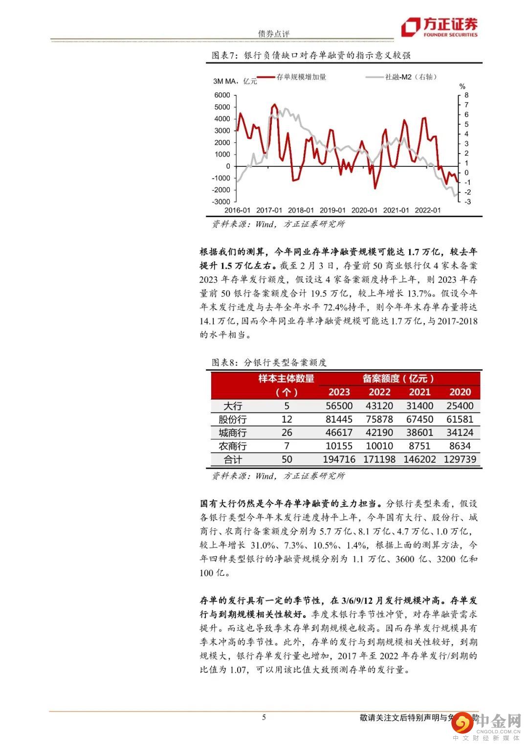截至2月3日,存量前50商业银行仅4家未备案2023年存单发行额度,假设这4家备案额度持平上年,则2023年存量前50银行备案额度合计19.5万亿,较上年增长13.7%。假设今年年末存单发行进度与去年水平72.4%持平,则今年年末存单存量将达14.1万亿,因而今年同业存单净融资规模可能达1.7万亿,与2017-2018的水平相当,较2022年有明显的增长。预计国有大行仍然是今年存单净融资的主力担当。