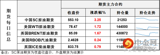 【1】WTI主力原油期货收涨1.33美元,涨幅1.72%,报78.4701美元/桶;布伦特主力原油期货收涨1.4美元,涨幅1.67%,报85.0901美元/桶;INE原油期货收涨3.25%,报553.101元。