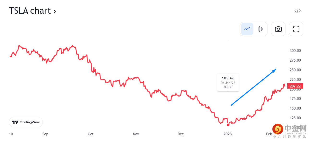 2 月 9 日,特斯拉股价收涨 3%,至 207.32 美元,期间涨幅一度扩大至 5%,报 211.82 美元,创近三个月新高。2023 年迄今,特斯拉股价上涨了 68%,较 1 月 4 日盘中低点更是上涨了 104%。