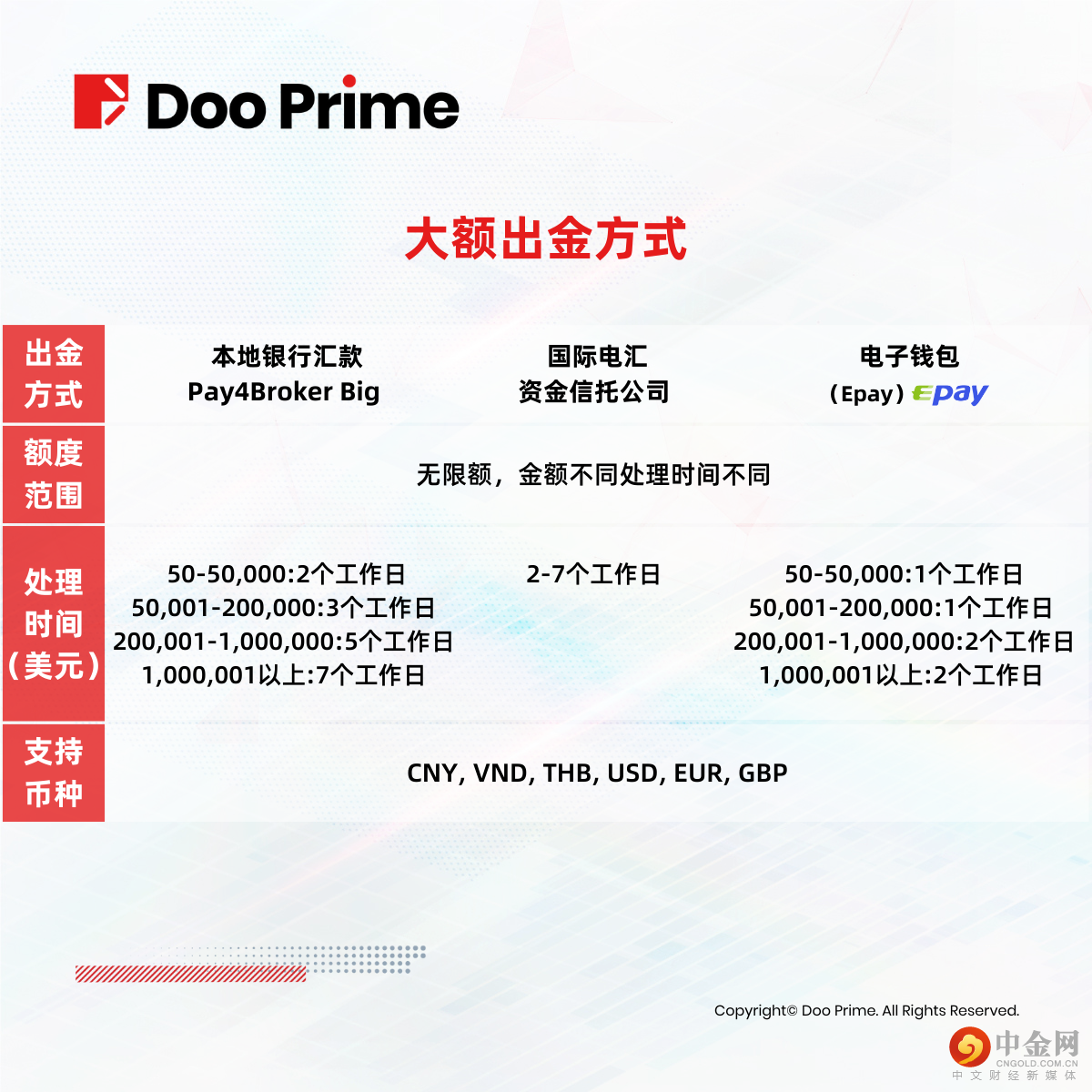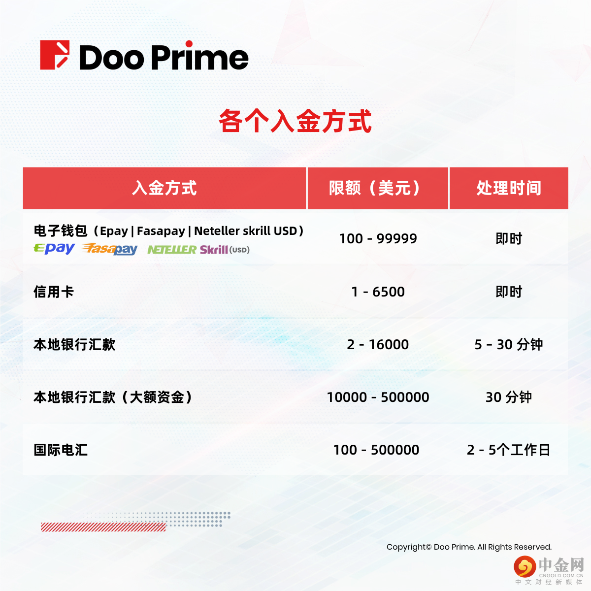 Doo Prime 始终将客户的利益放在首位,与权威银行合作为客户做好资金隔离管理,同时还提供多种安全的出入金方式,为投资者带来更好的交易体验。