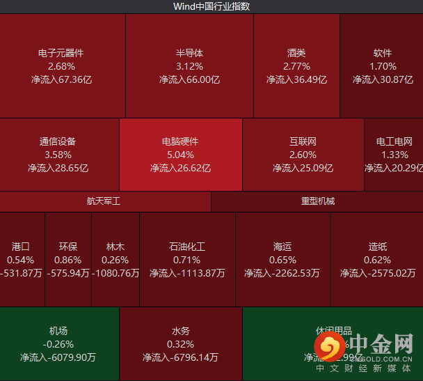 行业板块方面,电子元器件、半导体、酒类、软件等呈现净流入态势,休闲用品、水务、机场等内容资金净流出。