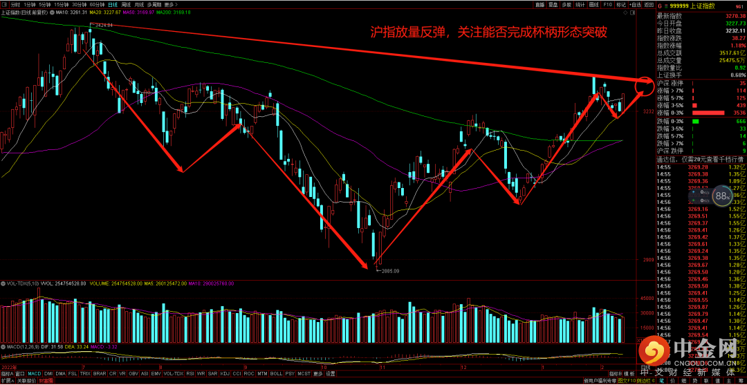 沪指昨日出现放量反弹走势,值得留意的是市场在20天均线的位置展现出来足够的支撑力。从整个形态而言,沪指有望完成中期日线级别的杯柄形态突破,需要紧密观察市场能否有效放量突破形态。