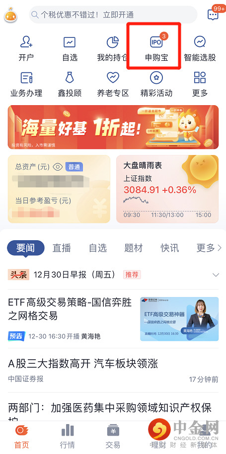 1、“申购宝”入口:金太阳APP升级到V5.9.0及以上版本号后,点击“金太阳首页——申购宝”,即可开启打新法宝。
