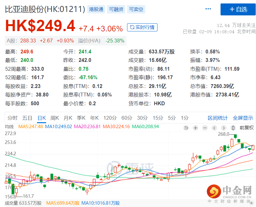 截至2月9日收盘,比亚迪H股涨3.06%,报收249.4港元/股,A股涨0.93%,报收288.33元/股。整体来看,比亚迪股价并未受到巴菲特减持影响。