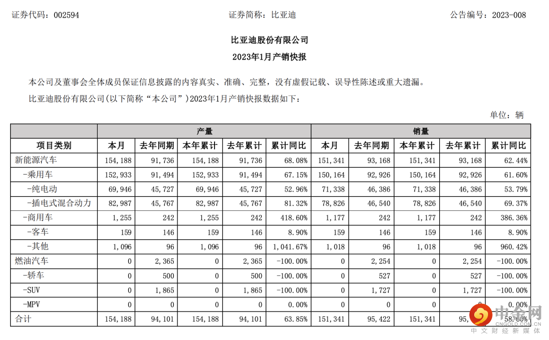 销量快报显示,比亚迪2023年1月销量为15.13万辆,同比增长58.6%。其中DM混动车型销量为7.88万辆,纯电车型销量为7.13万辆;王朝/海洋系列销量为14.37万辆,腾势品牌销量为6439辆,出口超1万辆。