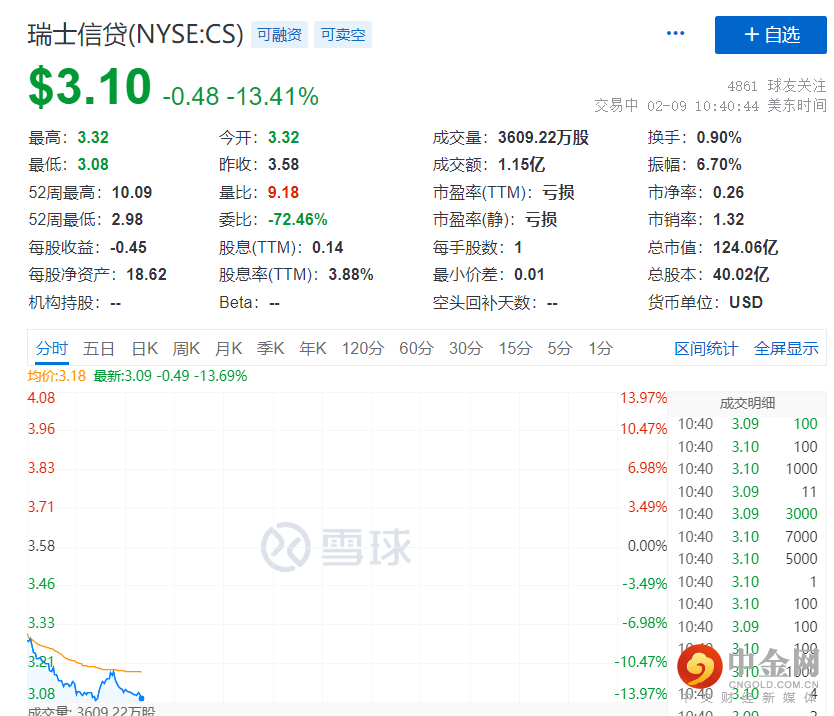 瑞士信贷跌超13%,已连续5个季度录得亏损,公司预计2023年将出现巨额税前亏损。