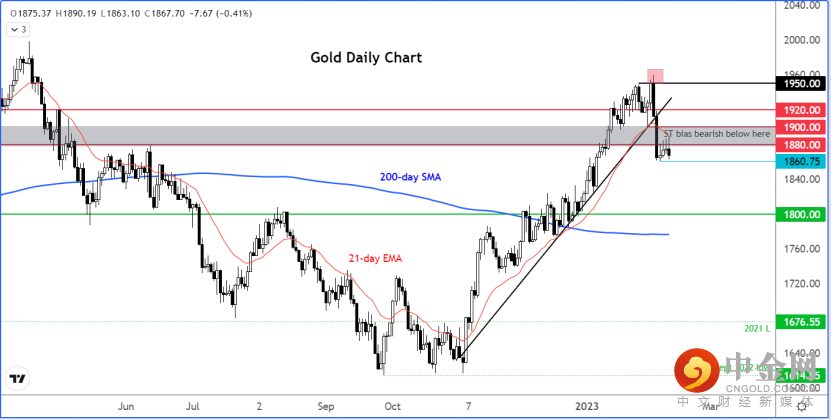 黄金最近几天通过盘整消化了许多利好美元的消息。然而,它还没有显示出任何复苏的迹象。多头需要观察它能否在日线图上形成关键的反转形态,理想情况是在当前点位附近形成反转。看涨锤形K线和高于1880美元的收盘价将是不错的起步。在看到反转之前,多头必须保持耐心。