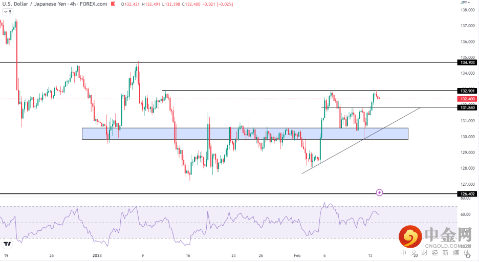 美/日昨天上涨0.7%,最高触及132.90。若今天看到好于预期的CPI和维持鸽派的日本央行共同作用,将有望继续推升汇价至134.70。下行方向,关注131.84的初步支撑,随后是趋势线所在的130.60附近。