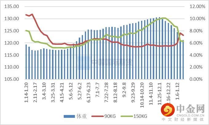 上周全国出栏平均体重121.17公斤,环比增长0.25%,150公斤以上出栏占比6.26%,下跌0.11%;90公斤以下占比7.26%,增长0.37%。近期猪价持续走弱,刺激年前没卖出的大猪持续出栏,整体出栏体均重增加。另外猪粮比跌破一级预警后的收储消息对市场信心提振较足,市场对短期止跌反弹预期较强,部分散户开始压栏,加上消费淡季市场对于大猪需求减少,预计生猪出栏均重有下降趋势。