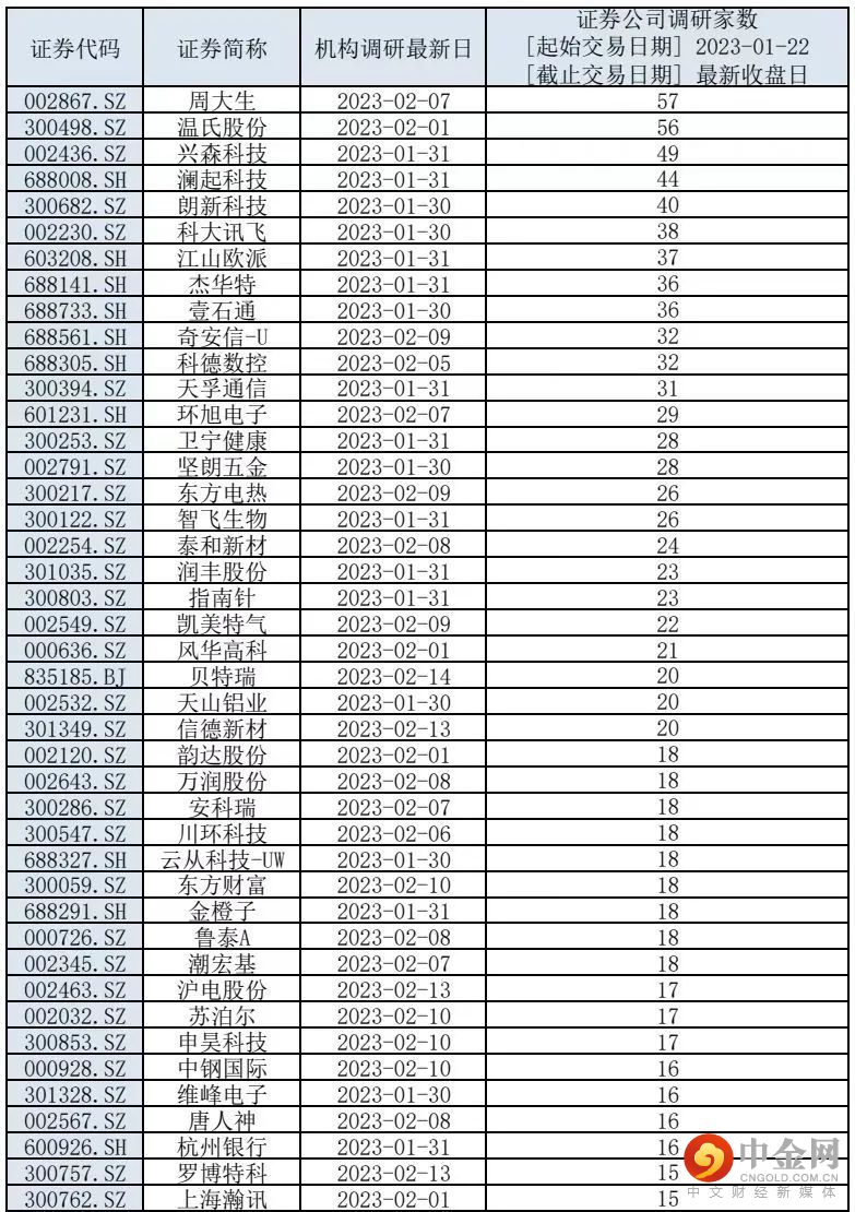 其中,周大生、温氏股份是券商春节后最为关注的公司,均吸引了超50家券商的调研。此外,包括兴森科技、澜起科技、朗新科技、科大讯飞、江山欧派、杰华特等22家公司也被不少于20家券商扎堆调研。