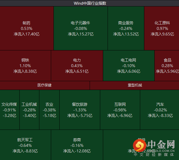 行业板块方面,制药、电子元器件、商业服务、化工原料等呈现净流入态势,软件、券商、航天军工等内容资金净流出。