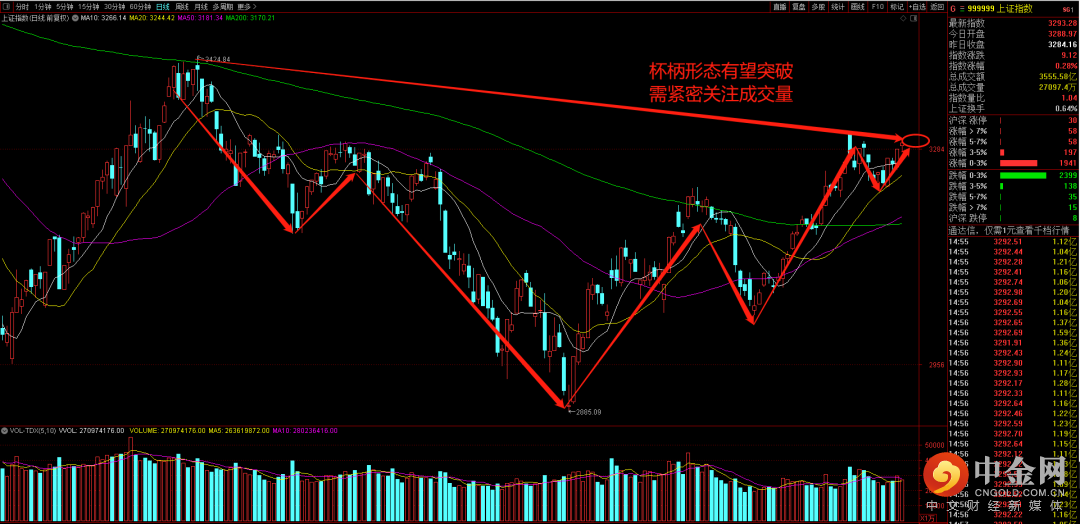 沪指构筑的杯柄形态目前来到突破口的关键位置,筹码结构来看上证指数在3200点区域曾经发生密集成交换手,市场在该区域的积累套牢盘偏多,后续指数上涨仍需套牢盘充分解套,后续需密切成交额是否持续放量。另一个积极迹象是,50天中期均线已经完成对200天长期均线的金叉突破,沪指在短中长周期开始呈现出多头排列,市场重心逐步向上抬高。