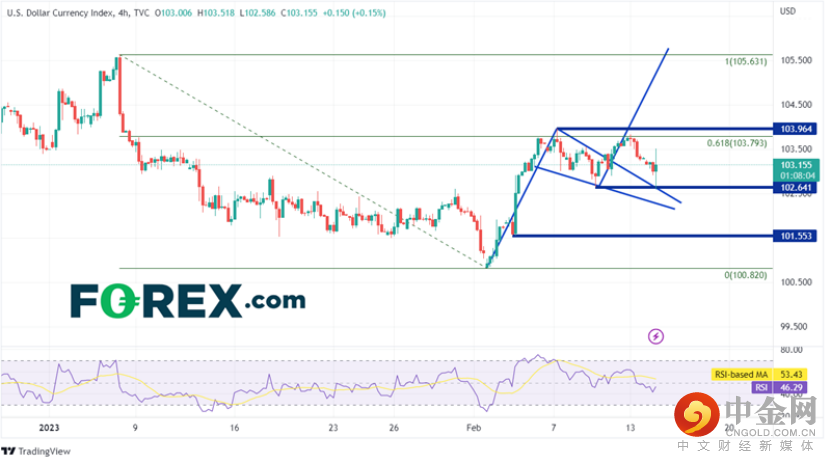 在240分钟图上,DXY自2月2日创下近期低点100.82以来一直在走高。该指数先是回调至1月6日高点到2月2日低点区间的61.8%斐波那契回撤位103.79附近。然后它回到三角旗形内,并在2月10日上破图形。然而,在CPI数据公布后,价格回落,重新测试三角旗的顶部趋势线和2月9日以来的低点102.64附近。如果价格能够突破近期高点103.96,那么下一个阻力位要到1月6日高点105.63,这也在三角旗形目标位附近。但是,如果价格跌破今天的区间,接下来的支撑位是三角旗形的底部趋势线102.25附近。在此之下,水平支撑位落在101.55,然后是2月2日低点100.82。
