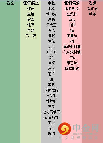 商品期货:黑色建材、农产品(豆菜粕、玉米)谨慎偏多;贵金属、有色金属、原油链条商品中性;