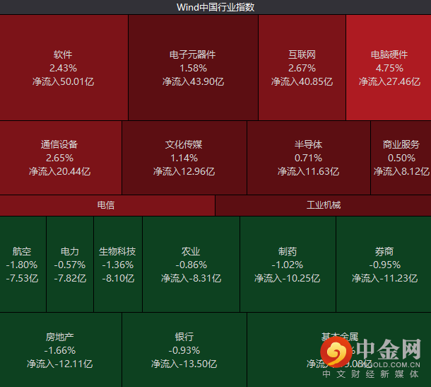 行业板块方面,软件、电子元器件、互联网等呈现净流入态势,基本金属、银行、房地产等内容资金净流出。