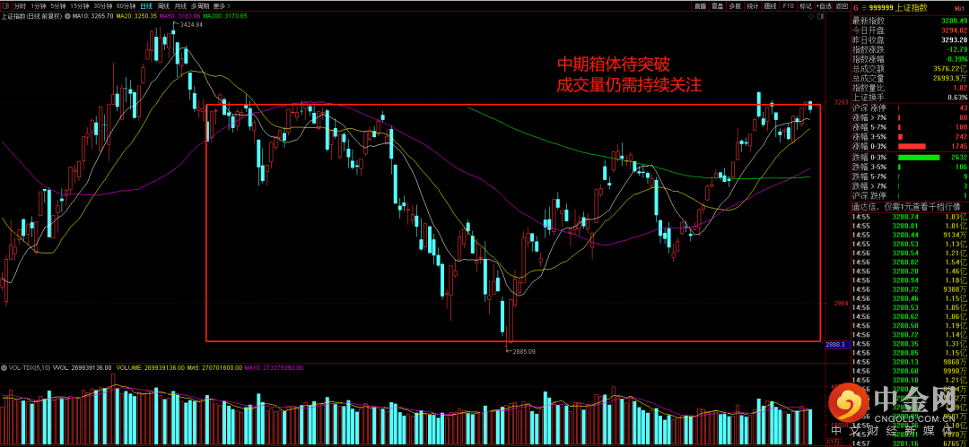该箱体区间是自去年七月份高点以来构筑的中期箱体,如能有效突破,对市场后期走势势必形成积极情绪提振。整体而言,近期需紧密关注成交量的变化,如能放量突破行情需高看一线。