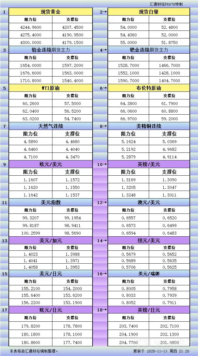 11月13日美市美市更新的黄金、白银、铂金、钯金、原油、天然气、铜(商品)以及:、欧元、英镑、日元、瑞郎、澳元、加元、纽元(热门货币对)的支撑阻力位一览。